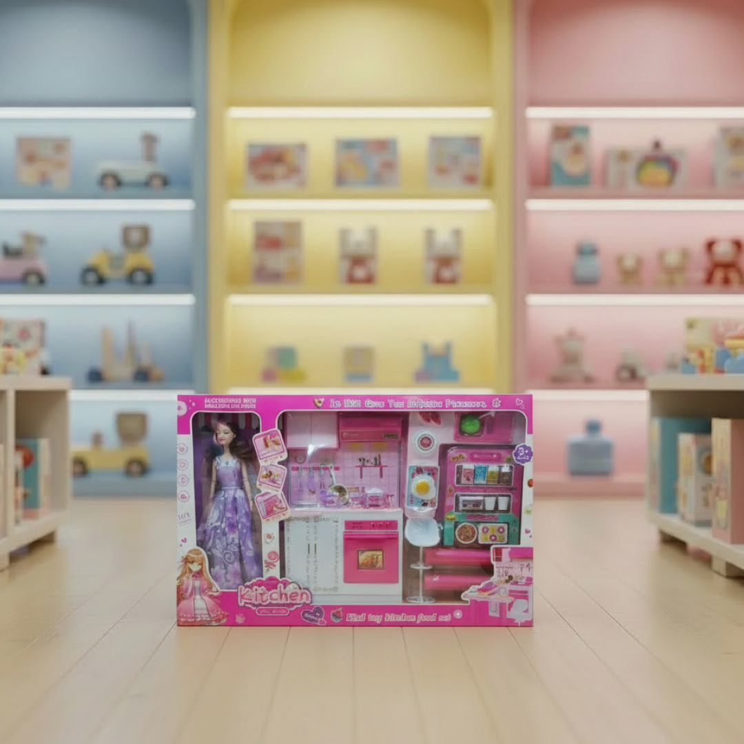 طقم مطبخ لعبة اجعلي لطفلتك ساعات من المرح والإبداع مع طقم المطبخ مع العروسة الوردي، حيث يجمع اللعب بين التعلم والخيال بطريقة آمنة وممتعة.احصل عليه من متجرنا little star stoy shop toys